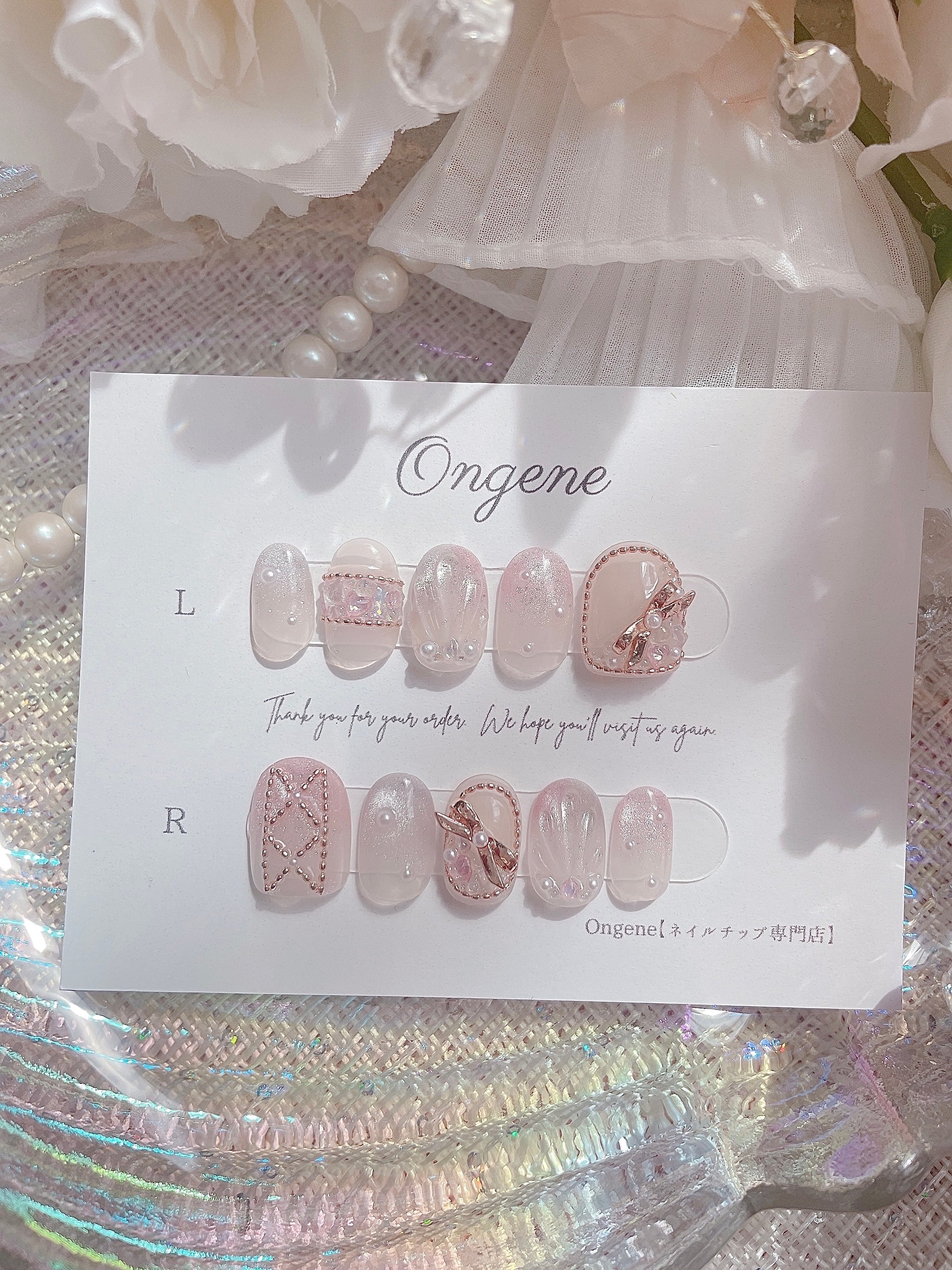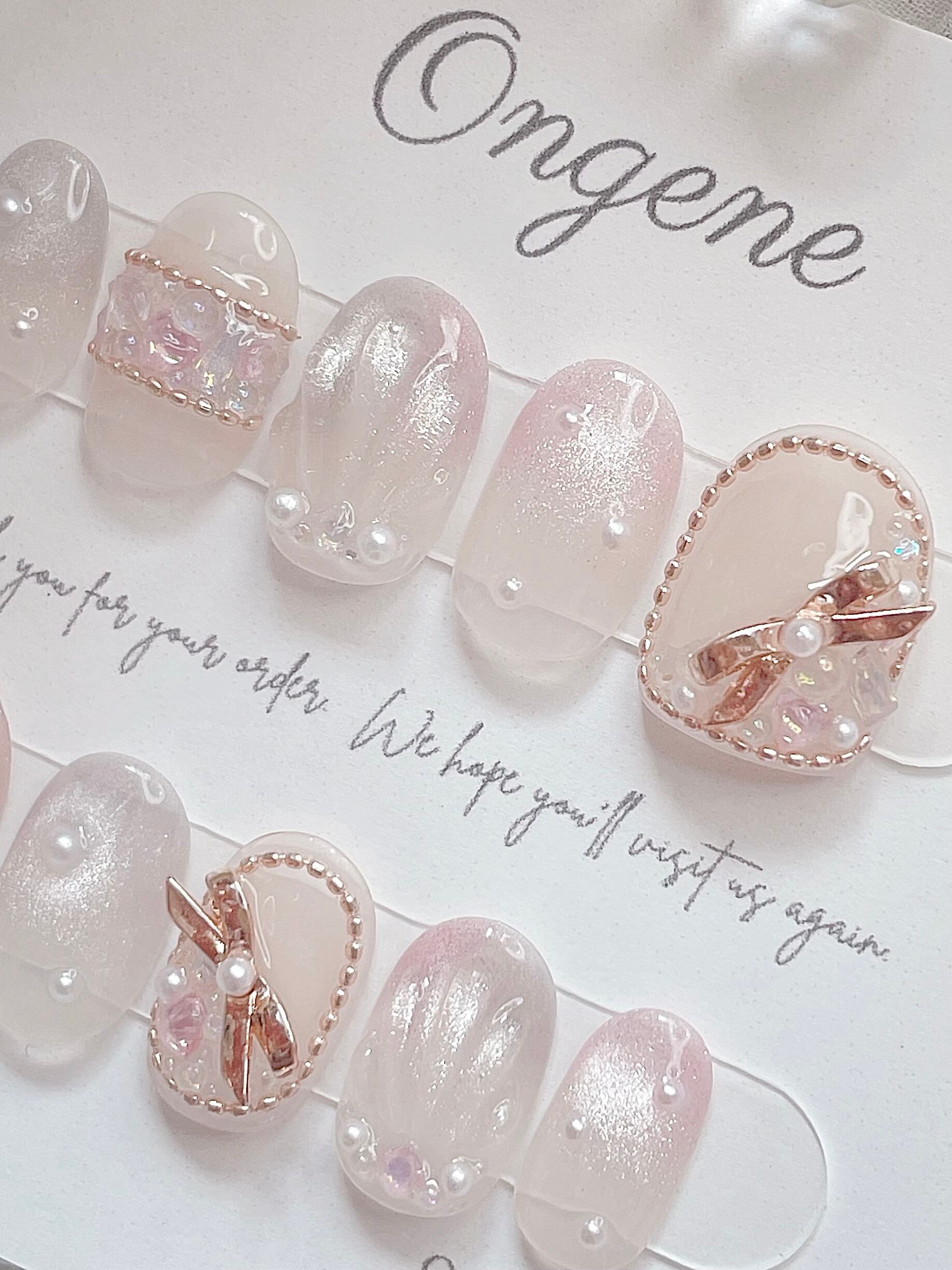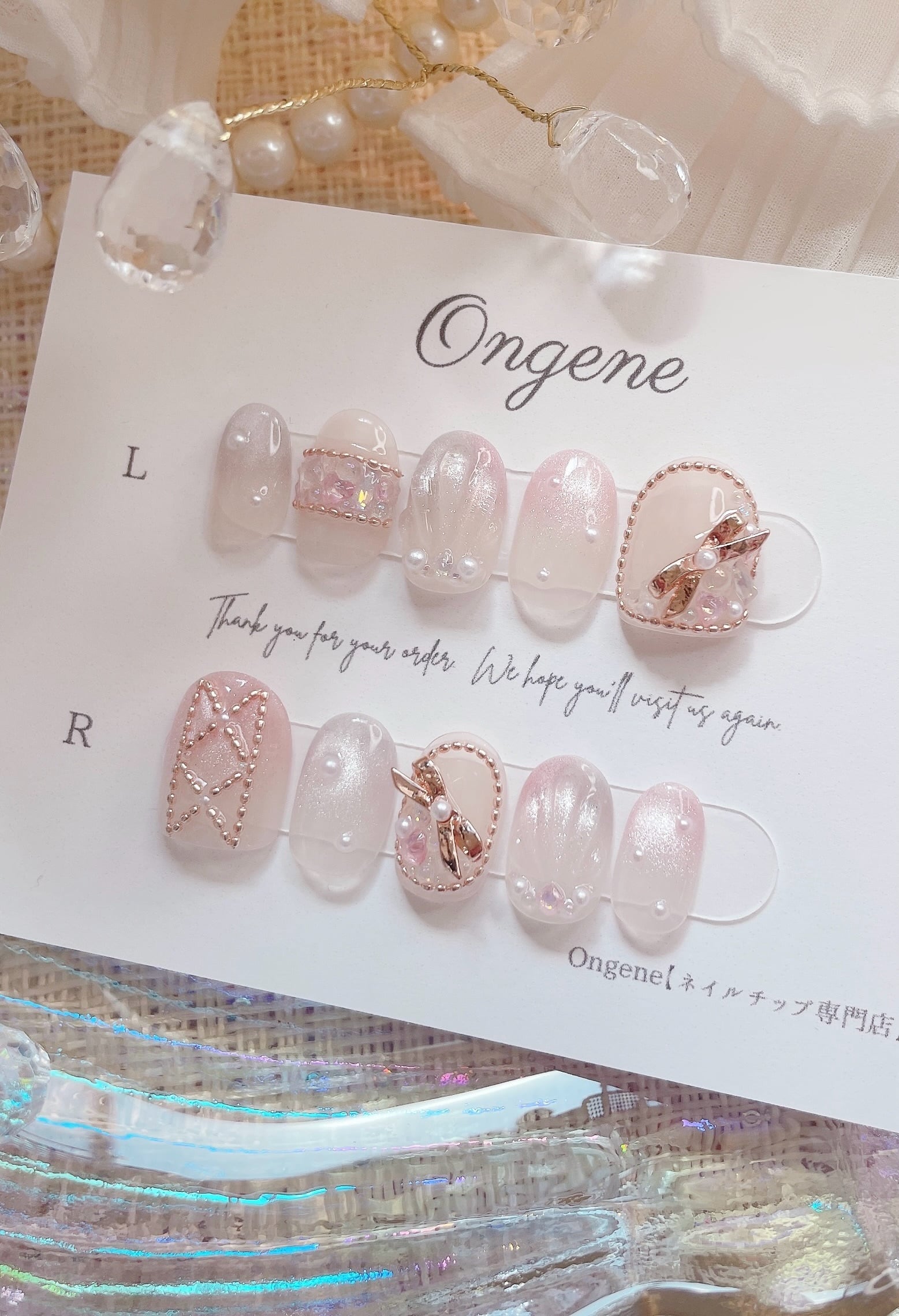 ピンクゴールドのリボンやチェーンがアクセントになって、ふんわりした色味の中にもしっかりと華やかさをプラス。