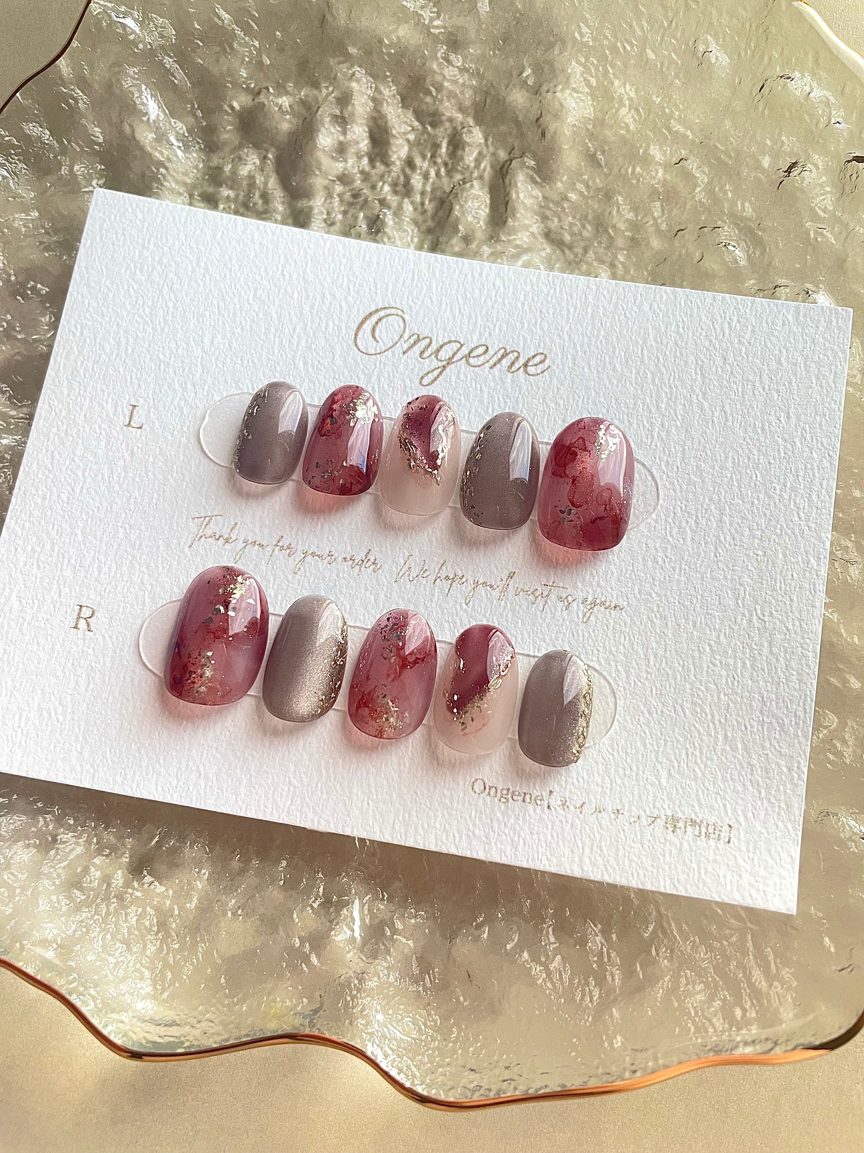 滲むようなインクアートに金箔やラメを散りばめ、シックな中に華やかさをプラスした秋めくニュアンスネイルチップです。