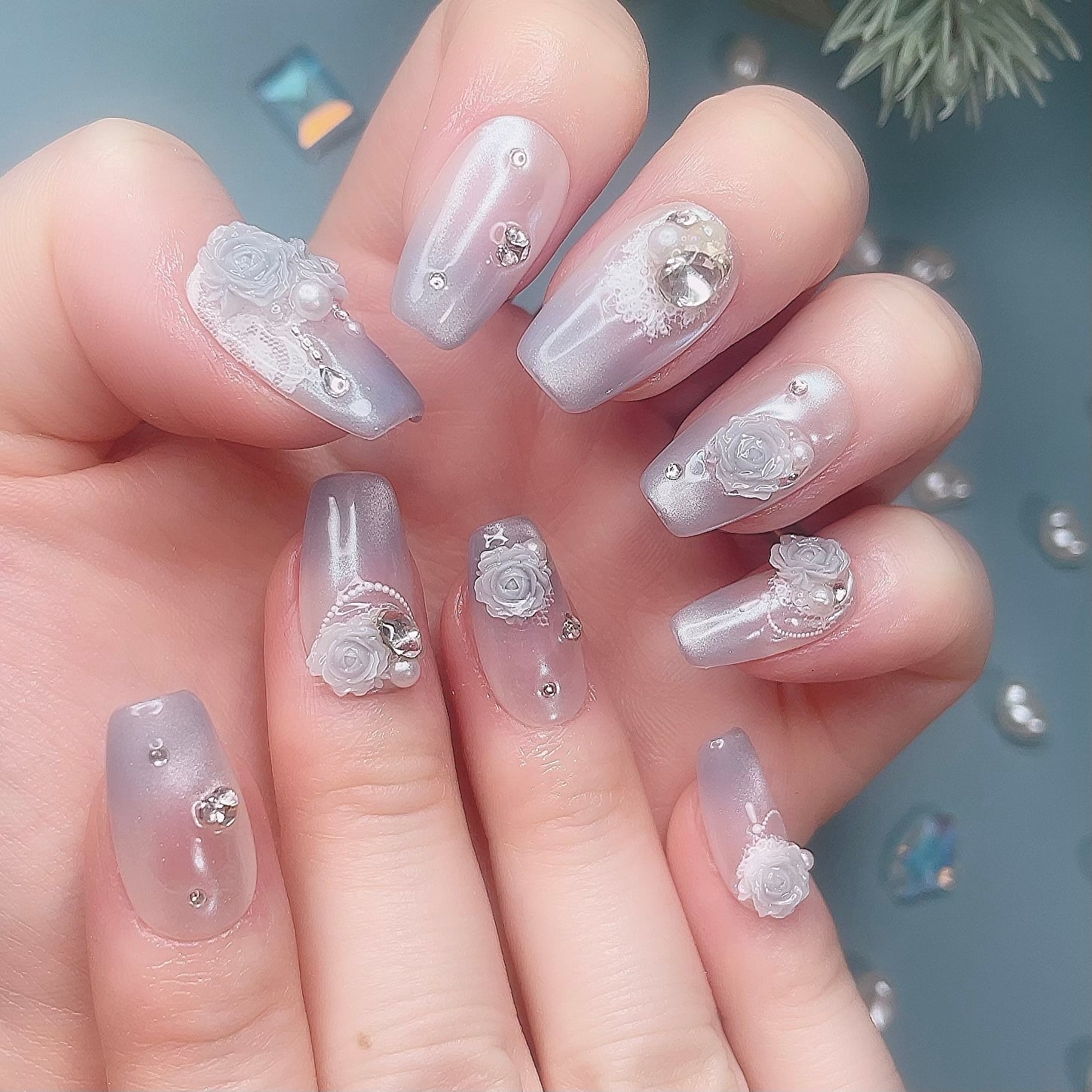 くすみブルーのマグネットカラーをグラデーションし、爪先に光を集めています。
